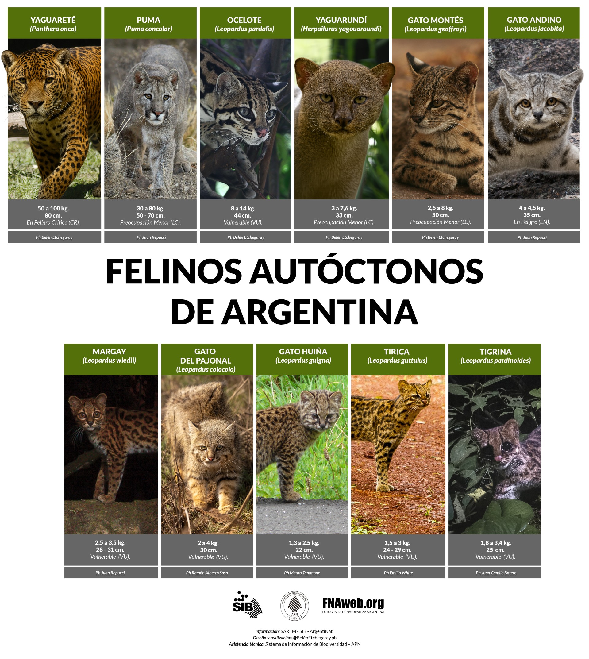 · De las once especies de felinos presentes en Argentina, seis están catalogadas como especies Vulnerables, una en Peligro y otra en Peligro Crítico.