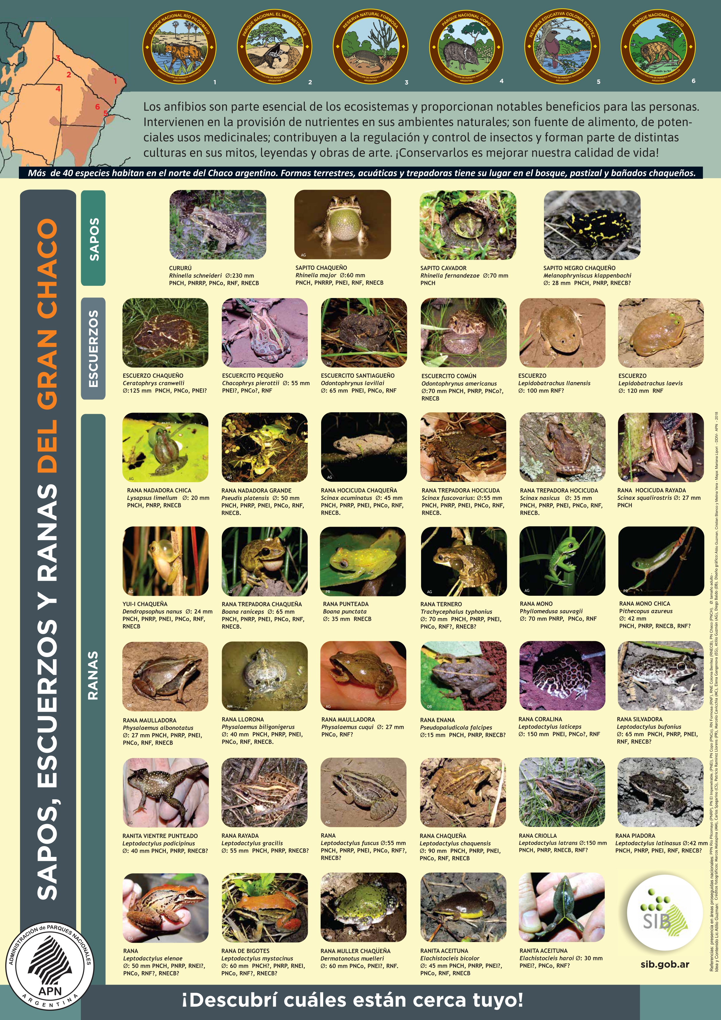 La publicación cuenta con fotografías de 39 especies que podremos encontrar en 6 áreas protegidas (Parque Nacional El Impenetrable, Reserva Natural Formosa, Parque Nacional Rio Pilcomayo, Parque Nacional Copo, Parque Nacional Chaco y Reserva Educativa Colonia Benítez) agrupadas en sapos, escuerzos y ranas para su fácil identificación entre los más chicos y no tan chicos. Su principal objetivo es como herramienta educativa y de divulgación.